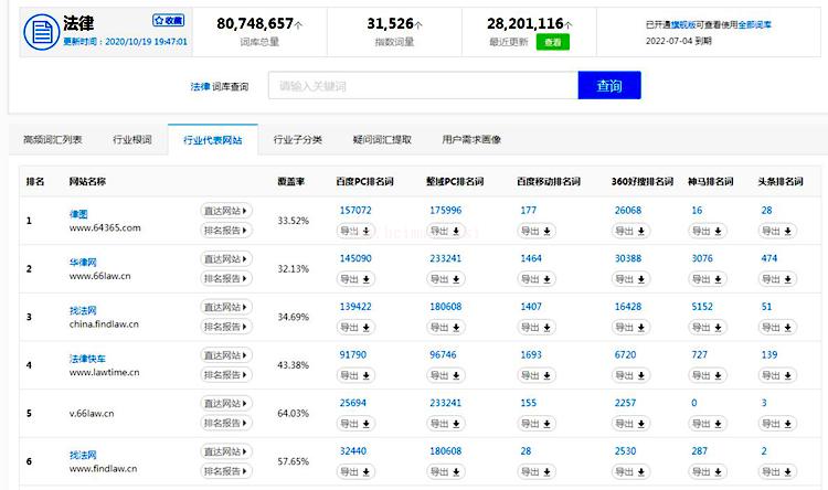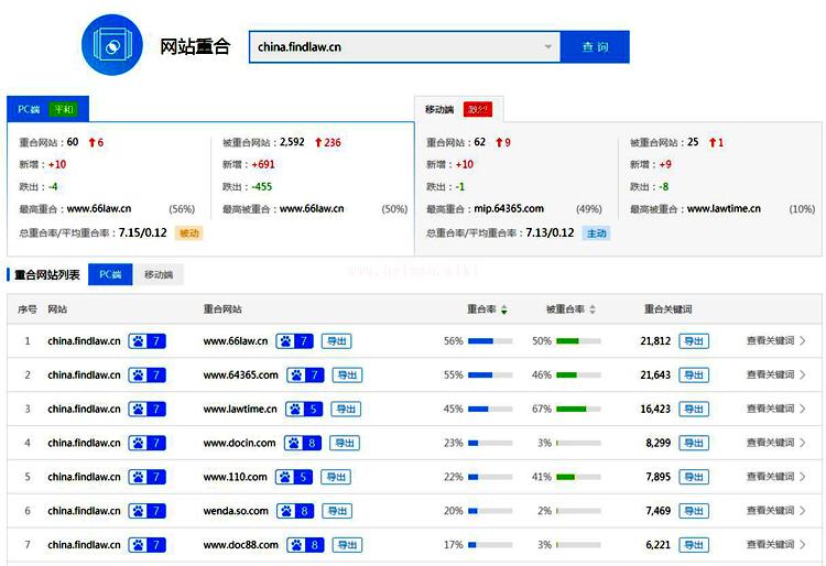 针对网站重合查询,我们可以清晰的看到和自己目标网站高度相关的网站有哪些,行业中一些高权重的站点,同时,其中,一个最为值得关注的点就是重合的关键词词库。